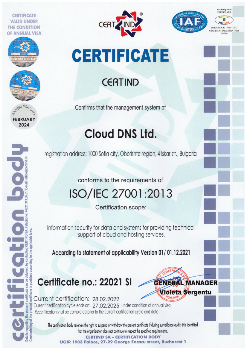 In our ongoing effort to deliver fast, reliable, and secure DNS services, we are proud to uphold the ISO 27001:2013 certification. This prestigious certification is not just a badge—it's our commitment to maintaining the highest standards of information security management. We diligently safeguard your data and ensure the integrity of our DNS hosting environment, so you can have complete peace of mind knowing that your and your users' information is protected by internationally recognized best practices. Our adherence to these stringent security measures demonstrates our dedication to delivering a service that you can trust, now and in the future.: